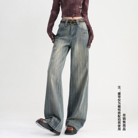 美式条纹牛仔裤女2025秋冬宽松垂感阔腿裤女休闲拖地长裤子女