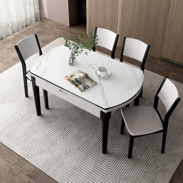 双虎家私 岩板餐桌伸缩家用小户型可变圆桌大理石纹轻奢餐桌椅